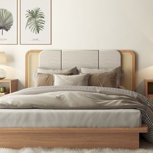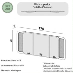 Características: Estrutura 100% MDF Acabamento em Pintura UV Detalhe Curvo em Palha Natural de Algodão Cabeceira Estofada Montagem com Detalhe Côncavo Ideal para Colchão de Solteiro (88 cm de largura) e Casal (138 cm de largura) NÃO ACOMPANHA CAMA NÃO ACOMPANHA COLCHÃO