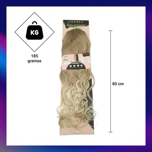 Especificações: - Material: Fibra Bio Orgânica - Peso líquido: 185 gramas - Comprimento: 80 cm - Estilo: Cacheado - Método: Clip com ajuste de cordão - Temperatura máxima: 150C