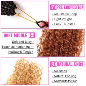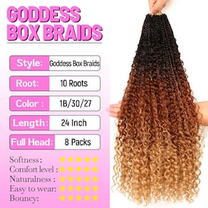 Característica do cabelo: cada fio tem 3 cachos, como os cachos de cabelo humano. Faz com que o cabelo pareça cheio e bonito. Material do cabelo: cabelo de crochê Goddess Boho Box Braids feito de cabelo sintético de baixa temperatura. Feito à mão, sem cheiro, amigável à pele, macio e leve. Comprimento e cor do cabelo: o comprimento do cabelo é de 14 polegadas, 18 polegadas, 24 polegadas e 30 polegadas. Há muitas cores diferentes para você escolher, como:1B, #4, #27, #30, #350, #T350, #T30, #T27, #T27 /613, T1B/30/27. Quantidade de cabelo: 8 pacotes em um pacote, e cada pacote tem 10 fios. Normalmente, 8 pacotes podem ser cheios para uma cabeça. Cabelo de crochê Goddess Box Braids para mulheres negras - para mulheres negras e beleza de mulheres negras.