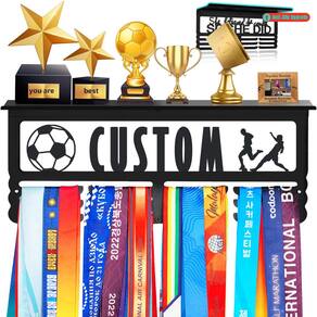 - Personalizado para você: personalize seu suporte de exibição de medalhas atualizado com seu nome ou slogan, gráficos esportivos decorativos, tamanho e cor para atender às suas necessidades específicas. Agora com uma prateleira de troféus adicional para exibir orgulhosamente seus troféus junto com suas medalhas. Este cabide de medalha atualizado mede 40,6 cm de comprimento e inclui uma prateleira resistente.