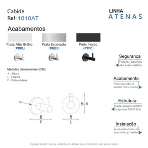 • Fabricado em metal aço inox e alumínio. • Disponível no Prata Alto Brilho, Escovado e Preto Fosco. • Pode ser instalado em parede, azulejo e porcelanato.