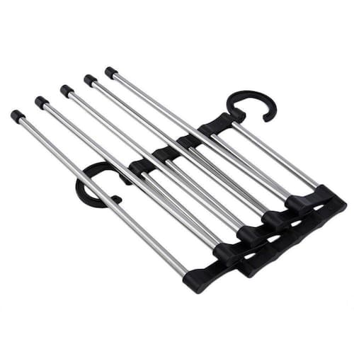 Soluciona o problema de espaço no seu guarda-roupas, colocando cinco peças de roupas no espaço de uma esse múltiplo cabideiro produzido com aço inoxidável extremamente durável. Permite duas funcionalidades tanto horizontal, quanto vertical facilitando a organização e salvando espaço.Usando os dois ganchos, ele fica na horizontal, facilitando o manuseio para colocar e tirar suas calças.Usando um gancho, ele fica na vertical e você economiza espaço de forma rápida e eficiente. Simples assim.Cada cabide possui 5 espaçosESPECIFICAÇÕES:Cor: Preto e Branco.Material: plástico e aço inoxMedida: 34 x 15 x 7 cmCONTÉM:- 1 unidade