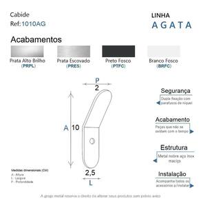 O cabide da linha Agata possui um design minimalista em linhas arredondadas, é uma peça de requinte que se destaca com luxo no seu banheiro. Além de decorar, organiza com funcionalidade o banheiro. Criado em metal nobre aço inox com uma qualidade que abrange áreas litorâneas e possui a de um acabamento muito resistente. Agora é só você adquirir este lindo acessório e fazer o seu projeto se tornar realidade com um banheiro prático para toda a sua família. Características Fabricado em metal aço inox. Disponível no Prata Alto Brilho, Escovado e Preto Fosco. Pode ser instalado em parede, azulejo e porcelanato. Benefícios Fixação prática e segura com parafusos e buchas inclusos. O produto não possui nenhum detalhe em plástico ABS . Fácil higienização, ideal para locais que exigem limpeza constante. Aproveitamento inteligente do espaço, ideal para ambientes compactos. Resistente à corrosão e luz solar. Itens ENVIADOS: 1 cabide, kit de parafusos e manual instrução instalação. Instalação INTELIGENTE Ao 1º furo, use uma broca medida menor, após use a medida correta e finalize, vai ajudar na precisão da fixação da bucha principalmente em azulejos e porcelanato. Marca: Não Informado