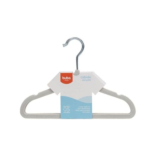 Os cabides de veludo da Buba possuem o tamanho ideal para roupas infantis. Com acabamento flocado, evitando que as roupas escorreguem ou desfiem. Além disso, são finos otimizando o espaço no armário, com curvas que não marcam as roupas.