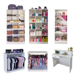 Com nossos expositores você terá muito mais espaço para organizar e expor tudo o que você precisa, deixando sua loja super linda, alavancando suas vendas e lhe proporcionando muito sucesso e lucratividade. É o seu sonho se tornando realidade! Nesse contexto, desenvolvemos móveis de fabricação própria, com otimização de processos e matéria prima de qualidade, com design detalhadamente elaborado, para levar até você o que há de melhor, com preço de fábrica. ------ Veja a descrição detalhada de cada item: ----- DUAS UNIDADES = A COLMÉIA 15 NICHOS BIA é excelente para armazenar e expor, ajuda na decoração e deixa tudo organizado e bem visível. Todo mundo ama ela! Colméia Bia: Altura: 182 / Largura: 90 / Profundidade: 34cm // MDP. Cada nicho tem: Altura: 33cm. Largura: 28cm. ----- DUAS UNIDADES = BALCÃO ARARA CAROL (A:97 / L:84 / P:30cm) É o móvel ideal para colocar no centro da sua loja, próximo à vitrine ou coladinho na parede. Nela você pendura várias peças de roupa e sobre o tampo poderá expor diversos objetos e até atender seus clientes! É indispensável! ------ UMA UNIDADE = BALCÃO DE ATENDIMENTO COM GAVETA (A:93 / L:90 / P:36cm) Ótimo para você guardar documentos e valores, fazer cálculos, usar o notebook ou celular e principalmente atender seu cliente! Super prático, deixa tudo organizado e mantém a discrição no atendimento. ------ UMA UNIDADE = ESTANTE LIZ = Altura: 182 / Largura: 57 / Profundidade: 30cm. Ela é cheia de prateleiras! Deixa tudo organizado, comporta todos os tipos de objetos e ainda ajuda a decorar a sua loja.