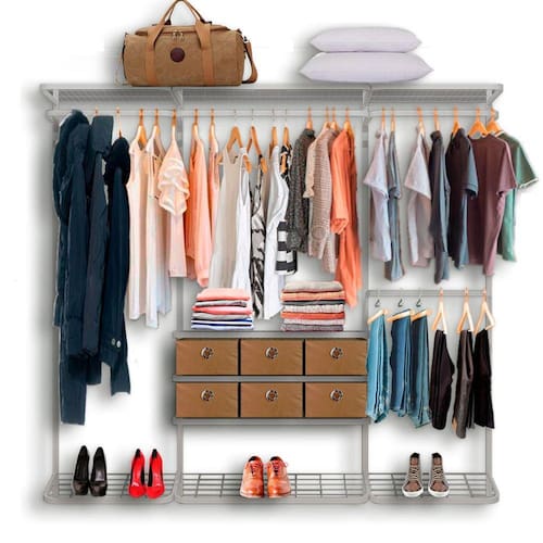 Este produto possui uma configuração padrão, priorizando cabideiros dois níveis e cabideiro para longos. Um dos módulos contém a parte inferior com prateleiras para adicionar peças dobradas ou caixas organizadoras.