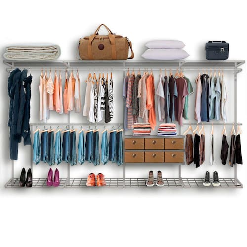Este produto possui uma configuração padrão, priorizando cabideiros dois níveis e cabideiro para longos. Um dos módulos contém a parte inferior com prateleiras para adicionar peças dobradas ou caixas organizadoras.