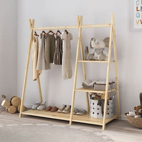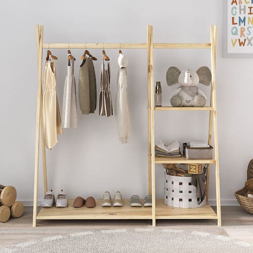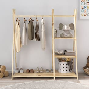 O Closet Infantil Arara Montessori Madeira Lotte foi pensado para estimular a independência desde cedo. Com estrutura em madeira maciça e design montessoriano, traz barra para cabides na altura da criança e prateleiras laterais perfeitas para brinquedos, sapatos ou acessórios. Funcional e encantador, ele é ideal para manter tudo em ordem de forma acessível, prática e cheia de charme.