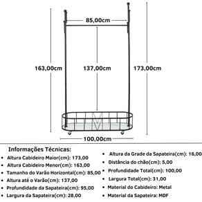 Fabricado com materiais de alta qualidade, o Cabideiro de Chão Grande com Sapateira e Rodízios é resistente e projetado para durar ao longo do tempo. Feito em metal alta qualidade e sua sapateira em MDF, o Cabideiro é um produto resistente e durável. A montagem é fácil e rápida, com todas as ferramentas e instruções necessárias incluídas no pacote.