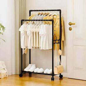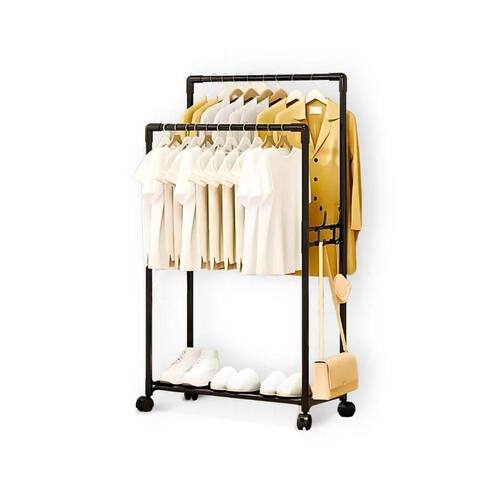 O cabideiro é composto por duas barras horizontais para pendurar roupas e uma sapateira integrada para calçados, tornando-o uma solução completa para o seu espaço. Sua estrutura é feita de materiais de alta qualidade, como tubos de aço e plástico resistente, garantindo durabilidade e estabilidade. Além disso, o produto é equipado com rodinhas, permitindo fácil mobilidade entre os cômodos, facilitando o rearranjo do ambiente conforme necessário.