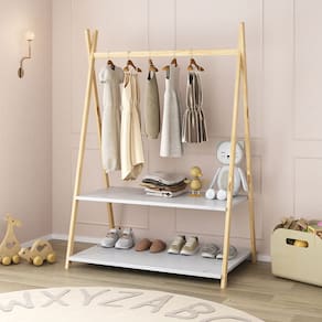 O Cabideiro Infantil Para Crianças Madeira Maciça Danilo possui estrutura em madeira natural e prateleiras brancas, trazendo leveza e um toque moderno para quartos montessorianos.