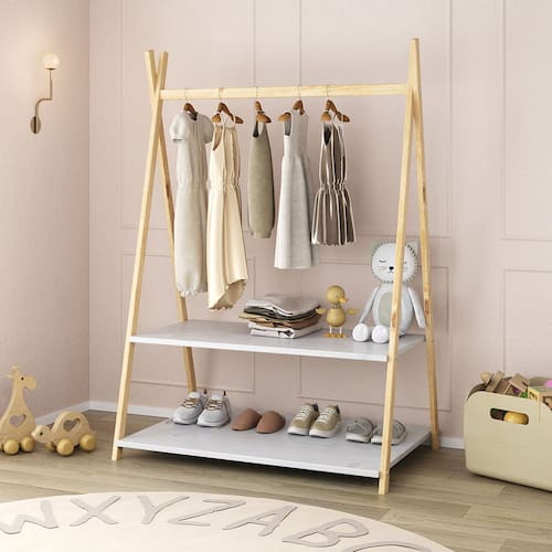 O cabideiro tem altura acessível para pendurar roupinhas com facilidade, e as duas prateleiras permitem organizar sapatos, brinquedos e objetos do dia a dia.