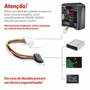 Atenção! Utilize esse adaptador somente em peças de baixo consumo energético, como: Leitor/Gravador de CD/DVD, HD/SSD, Fita LED, Exaustores e Coolers.