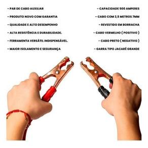 Especificações técnicas - capacidade 500 amperes - cabo com 2,5 metros 7mm - revestido em borracha - cabo vermelho positivo - cabo preto negativo - garra tipo jacaré grande