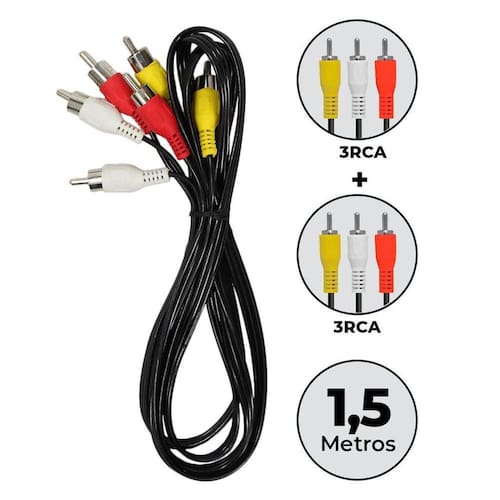 Cabo Av 3rca X 3rca 1,5m Vídeo Som Tv Tubo Conversor Dvd Cabo AV 3 RCA x 3 RCA O Cabo RCA é utilizado para transmissão de som de um equipamento.Indicado para ligação de equipamentos que devem enviar imagem e som saída RCA (fêmea): Vídeo Cassete, DVD, Home Theather, Blu-ray, aparelhos de TV a cabo, etc Especificações:- Conexão: Plugs RCA macho banhados- Cabo emborrachado de alta qualidade e resistente- Padrão de cores: segue todas as normas, sendo: Amarelo (Imagem), vermelho e branco (áudio estéreo)- Comprimento: 1,5m- Cor: Preto Conteúdo:- 1 Cabo Auxiliar 3 RCA para 3 RCA 1,5m
