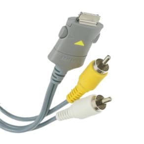 Cabo AV Samsung modelo TAD137ESE com conectores RCA amarelo e branco, utilizado para transmissão de áudio e vídeo de dispositivos compatíveis com conector proprietário da marca. Ideal para ligar câmeras e aparelhos antigos da Samsung em TVs ou monitores com entrada RCA.
