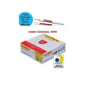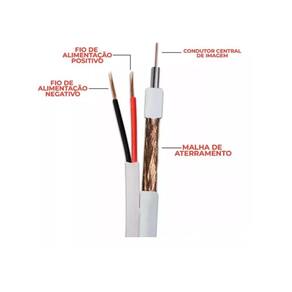 Especificações: Condutor Central: Fio de cobre nu com diâmetro de 0,4 mm. Isolamento Interno: Polietileno de baixa densidade (PE) com diâmetro de 2,5 mm. Blindagem: Malha trançada de fios de cobre (85% de cobertura), proporcionando proteção contra interferências eletromagnéticas. Condutores de Alimentação: Dois fios de cobre de 26 AWG para alimentação (até 12V), cada um com diâmetro de 1 mm. Isolamento Externo: Composto termoplástico de cloreto de polivinila (PVC) de 70°C antichama. Capa Externa: Capa de PVC com diâmetro total de 4 mm, resistente a danos físicos e ambientais.