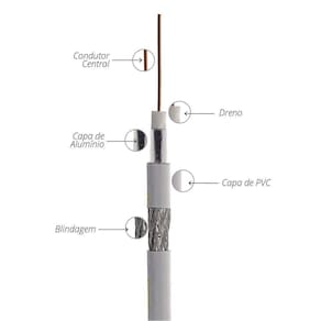 Cabo Coaxial Rg6 - 1 Metro Cabo Coaxial RG6 é ideal para instalação de antenas, CFTV, Parabólicas e sistemas de TV a cabo em geral. Possui malha de 95% e isolamento Interno de polietileno PVC 70C Anti Chama. Fita de poliéster aluminizada mais uma malha de fios de alumínio ou cobre estanhado 95%. Indicado para instalações de antenas VHF/UHF/Digital, parabólicas e sistemas DTH.