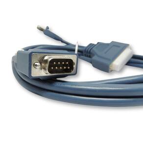 Cabo console multifuncional V5-Aux Cable com 3 metros de comprimento, projetado para conexão de terminais a equipamentos de rede e modems. Uma extremidade possui conector RJ45 padrão console; a outra extremidade oferece dois conectores seriais - DB25 macho e DB9 macho - para suporte a portas AUX e DTE/DCE.