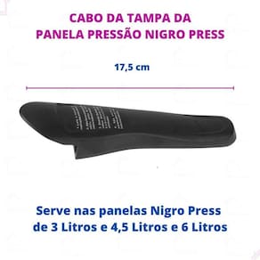 Nosso empenho é procurar o que há de mais atual e funcional no mundo culinário e para organização da sua casa, priorizando sempre a qualidade e a versatilidade dos produtos. Cabo da tampa panela nigro press 3 / 4,5 / 6 l Cabo superior da tampa da panela nigro press de 3 / 4,5 / 6 litros. O cabo é fabricado em baquelite antitérmico que garante ainda mais segurança durante o uso, pois reduzem a propagação do calor. Acompanha os dois parafusos para fixar na panela. Serve nos modelos: Nigro press de 3 litros; Nigro press de 4,5 litros; Nigro press de 6 litros. Atenção: não acompanha cabo inferior, alças, válvula de segurança e pino. Somente o cabo superior da tampa. Medidas: 17,5 cm x 4,5 cm Material: Baquelite e parafusos de alumínio Conteúdo da embalagem: 1 cabo superior panela nigro press Gostou Esse produto pode ser seu aguardamos sua compra Marca: Não Informado Ean: 7898749650227