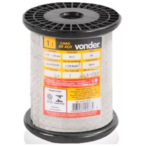 O Cabo de Aço Vonder é indicado para instalação de cerca elétrica, manutenção de vidro elétrico de veículos, entre outras funcionalidades. Indicado para cargas estáticas e operações sujeitas a atrito. ATENÇÃO: para segurança e do produto, mantenha sempre a etiqueta com o selo de conformidade do Inmetro junto à bobina do cabo de aço. Possui ótima resistência à abrasão, pouca flexibilidade e maior resistência à corrosão e oxidação. Características do cabo: Diâmetro do cabo de aço: 1/16 - 1,59 mm Tipo de alma do cabo de aço: AA - Alma de Fibra Construção do cabo de aço: 6 x 7 Comprimento da bobina do cabo de aço: 100 m Tipo de torção do cabo de aço: TRD - torção regular a direita Qualidade da camada de zinco do cabo de aço: B Norma do cabo de aço: ABNT NBR ISO 2408 Construção da perna do cabo de aço: 1-6 Categoria de resistência do cabo de aço: 1770 N/mm² Carga de ruptura mínima do cabo de aço: 1,61 kN Carga de ruptura mínima do cabo de aço: 164 kgf Lubrificação no cabo de aço: Não