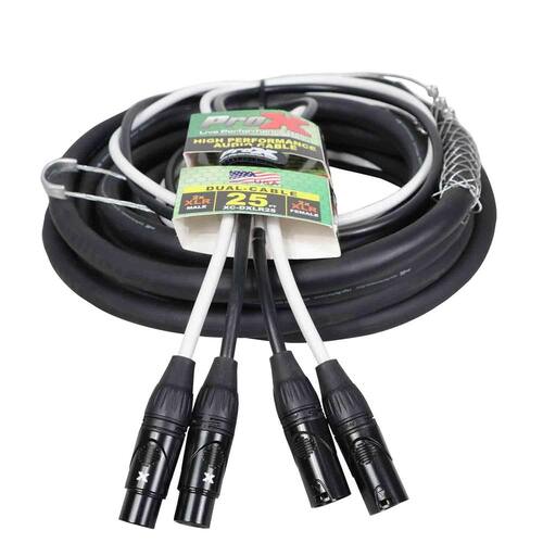 IMPORTANTE: Se for um produto elétrico, ele pode ser compatível com uma tomada de 110 volts. Se utilizado fora dos Estados Unidos, pode ser necessário um conversor de voltagem para garantir a operação adequada. Verifique se o produto que você está comprando é elétrico antes de considerar essas informações. Descrição: Cabo de áudio duplo XLR-M para XLR-F duplo de alto desempenho ProX XC-DXLR25 de 25 pés. Os cabos ProX Live Performance Gear são feitos para durar toda a vida. Cada cabo é feito com materiais de alta qualidade e fornece um sinal e uma conexão claros a cada vez. Esses cabos são feitos por profissionais para profissionais como você. Cada cabo é construído para alto desempenho e para suportar o uso diário pesado. Tipo de cabo: Cabo duplo Conector 1: Dual XLR macho Conector 2: Dual XLR macho Especificação: Balanceado A construção: Nossos cabos são revestidos com conectores dourados e prateados para uma transferência de sinal superior. 12 AWG - 93% de condutores de cobre trançado sem oxigênio (OFC) que fornecem uma transferência de sinal ideal. Controle de qualidade: testamos cada cabo para garantir que cada um funcione da melhor maneira possível, o que inclui alto desempenho e flexibilidade que podem lidar com o uso diário pesado. Esses cabos são projetados especificamente para fornecer muitos anos de som cristalino e durabilidade. Fabricamos cabos para instrumentos, cabos para alto-falantes, cabos RCA, cabos DMX, cabos de alimentação e muito mais. Nossos cabos são feitos para profissionais, por profissionais. A caixa principal contém: 10 unidades por caixa