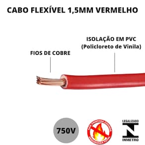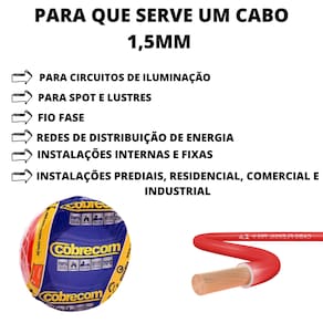São recomendados para instalações internas, comerciais, industriais e residenciais de luz e força, sinalizações, circuitos de comando e etc. Produto com ótima flexibilidade, facilitando seu manuseio e instalação. instalações internas e fixas em circuitos de força, luz, entre outros.Detalhes do seu produto:NORMAS APLICÁVEIS: NBR NM 247-3 e NBR NM 280 da ABNT.SELO SEGURANÇA COMPULSÓRIO INMETRO: REGISTRO 004020/2017Especificações Técnicas:- Marca: cobrecom- Tipo: Fio Cabo- Modelo: Cabo Flexível - Comprimento: 100 Metros- Composição: Cobre e PVC- Bitola: Cabo de 1,5mm- Tensão nominal: 750V