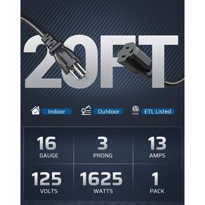 1 - Cabo de extensão longo para uso externo – O cabo de alimentação de extensão de 20 pés funciona com aparelhos internos e externos; estenda o comprimento de um cabo de alimentação existente até a tomada de parede; perfeito para áreas difíceis de alcançar atrás dos móveis; plugue compacto não afetará o uso de outros plugues - Fio impermeável SJTW 16/3C – Feito de fio SJTW atualizado de calibre 16/3 (avaliado à prova de intempéries). Esta extensão de cabo de alimentação é adequada para temperaturas de -40 °C a 60 °C; revestimento de PVC protege contra umidade, abrasão e luz solar direta; Observação: certifique-se de que as conexões não devem ser imersas em água - Cabo durável de alta qualidade – CA 125V/13A/1625W potência nominal; construído com fio de cobre, lâminas reforçadas e cabos revestidos pretos duplos; possui design de moldagem completa; suporta uma vida inteira de desgaste, certificado pela ETL - Compatibilidade universal: o cabo de extensão de 3 pinos é compatível com lâmpadas, computadores, scanners, luzes de pátio e eletrodomésticos que exigem um conector de alimentação de 3 pinos macho para fêmea; ideal para locais de trabalho compactos ou escritórios domésticos; NEMA 5-15P para NEMA 5-15R - Cabo de extensão flexível – O material exclusivo do fio permanece flexível mesmo em clima frio; sem emaranhados, fácil de enrolar e armazenar