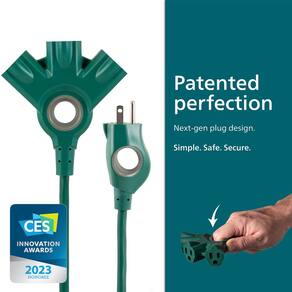 - Especificações do cabo: o cabo de extensão de 3 fios aterrados e 16 AWG é classificado para 125 VAC/13 A/1.625 W e estende três saídas aterradas de três pinos de qualquer receptáculo aterrado
