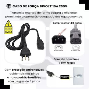 - Cabo: Flexível tripolar macho/IEC C13 fêmea