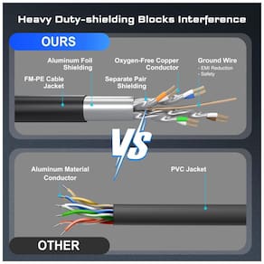 Serviço pesado e acesso O cabo Ethernet Cat8 com fidelidade quádrupla é supereficiente na redução direta da interferência EMI , RFI e fornece mais fidelidade para transmissão cega de dados de longa distância. Com PVC atualizado, Cat8 é provadágua e anticorrosão e mais resistente e móvel para trabalhos pesados. Pode ser enterrado diretamente sob o solo. Adequado para uso interno e externo.