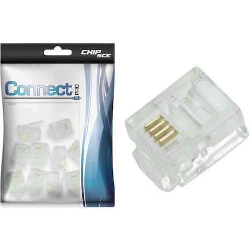 O conector macho RJ-11 atende às necessidades das redes de telefonia analógica e digital. Aplicável em instalações internas e externas, usado também em PABX digitais, pois, possui 6 vias e 4 contatos.
