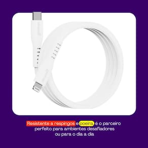 Cabo em silicone USB-C para Lightning na cor branca Com sua construção em silicone de alta qualidade, este cabo é incrivelmente flexível, permitindo fácil manuseio sem preocupações com quebras ou danos aos fios internos. Seu design resistente a respingos e poeira garante que você possa utilizá-lo em qualquer ambiente, seja em casa, no escritório ou em suas aventuras ao ar livre. Incluímos um organizador conveniente para guardar o cabo com facilidade, seja no bolso ou na mochila.\nCategoria: