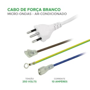 - Tipo: Cabo de Alimentação - Corrente Elétrica: 10A - Voltagem: 250V - Comprimento: 1,45 metro - Aplicação universal: Micro-ondas e ar-condicionados - Funções: Fornecimento de energia elétrica, estabilização de corrente Marca: Não Informado