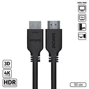 Dados Técnicos: Tamanho do cabo: 50 cm Material do cabo: cobre puro 30 AWG Largura de banda máxima: 18Gbit/s Resolução máxima: 4K (60Hz) Máximo de canais de áudio LCPM: 32 Taxa de áudio: 1536 kHz HDR Estático Suporta 3D Possui conexão Ethernet Conector HDMI macho/macho