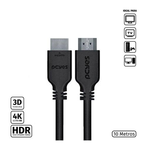 Dados Técnicos: Tamanho do cabo: 10M Material do cabo: cobre puro 30 AWG Largura de banda máxima: 18Gbit/s Resolução máxima: 4K (60Hz) Máximo de canais de áudio LCPM: 32 Taxa de áudio: 1536 kHz HDR Estático Suporta 3D Possui conexão Ethernet Conector HDMI macho/macho