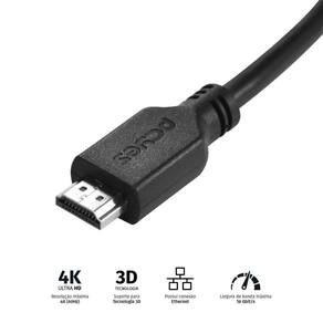 Descrição: Este cabo é indicado para dispositivos que possuam conexão HDMI tais como: TVs, monitores, Aparelhos Blu-ray, video-games, placas de vídeo, notebooks etc Dados Técnicos: Tamanho do cabo: 15M Material do cabo: cobre puro 30 AWG Largura de banda máxima: 18Gbit/s Resolução máxima: 4K (60Hz) Máximo de canais de áudio LCPM: 32 Taxa de áudio: 1536 kHz HDR Estático Suporta 3D Possui conexão Ethernet Conector HDMI macho/macho