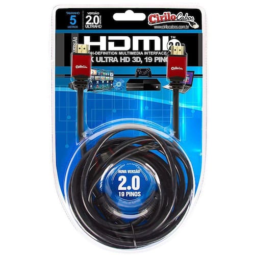 Ideal para conectar aparelhos compatíveis com a tecnologia hdmi como notebooks, tvs, vídeo games, projetores, entre outros, o cabo hdmi versão 2.0, 19 pinos, 4k, ultra hd, 3d da cirilo cabos, oferece som e imagens perfeito. Tenha resolução de cinema 4k e som digital. Cabo hdmi versão 2.0, 19 pinos, 4k, ultra hd, 3d com 5 metros.