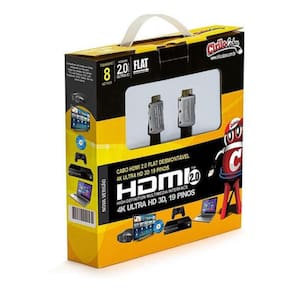 Cabo Hdmi 2.0 Flat Desmontável Ultra Hd 3D, 4K - 8 Metros Os conectores banhados a ouro proporcionam transferência irretocável de áudio e vídeo. O ouro é um excelente condutor elétrico e permite transferência de informações e dados de maneira rápida e confiável, com resolução de cinema 21:9 e reprodução de som impressionante em 32 canais. Além da excelente atuação, a pintura especial garante resistência à corrosão e oxidação.