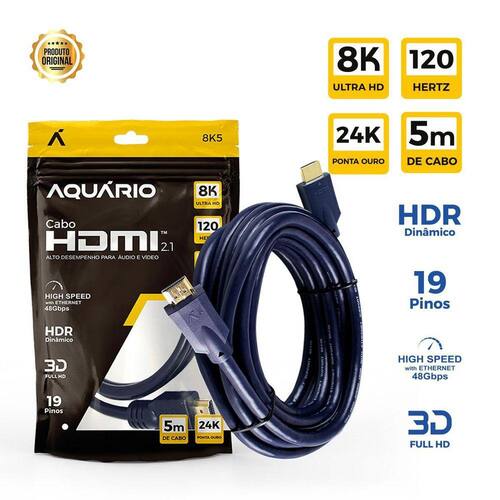 Tamanho do cabo 5 metros. Versão 2.1. Canal de retorno de áudio ARC. Resolução 8K HD 7680x4320p 60Hz / 120Hz 4K . Compatibilidade Equipamentos dos padrões anteriores 2.0, 1.4 e 1.3 . Conectores banhados a ouro. Fácil de instalar. Ean: 7898127608635