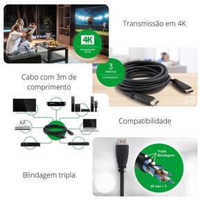 Cabo com 3m de comprimento: o cabo hdmi possui 3m de comprimento, facilitando a conexão dos dispositivos.