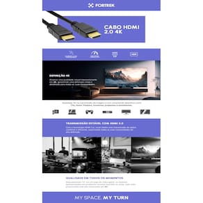 Cabo HDMI 2.0 4K 1,5M HD201 Fortrek FK 722C Modelo: HD201 | FK 722C Nova embalagem, mesmo produto. Com novo design, mais clean e com linhas mais modernas, nossas embalagens também estão de cara nova. Nos apropriamos da Cor roxa e o nosso logo virou protagonista, gerando sempre uma associação a nova identidade, que representa o seu espaço. Não se preocupe, nova logo, nova embalagem, mesmo produto! O Cabo HDMI 2.0 4K 1,5M HD201 Fortrek agora é Cabo HDMI 2.0 4K 1,5M HD201 Fortrek FK 722C, um modelo ideal para conectar notebooks, monitores, vídeo games, projetores e qualquer dispositivo que aceite HDMI trazendo alta qualidade tanto de áudio quanto de vídeo. Características: - Tipo: Cabo HDMI para HDMI - Conector: HDMI macho x HDMI macho - Revestimento: PVC - Comprimento: 1,5 metros