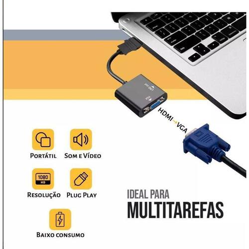 Utilize em placas mãe que tem saída para dois monitores, mas uma delas é em HDMI Plug and play Não requer alimentação externa Comprimento do cabo com entradas P2 é de um metro Condutor de cobre de alta dureza, com terminal, tornando-o resistente ao desgaste e evitando perda de sinal Entrada HDMI 1.0. Não necessita de fonte de energia Plug & Play Resolução até 720p / 1080i/ 1080p Saída de áudio estéreo P2 2.5 Saída de Vídeo VGA Entrada: HDMI O adaptador suporta até a frequência de 60 hz.