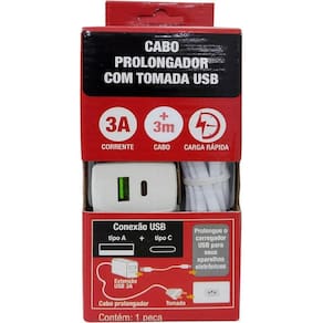 Cabo prolongador 3a com tomada usb 3m branco force line Cabo prolongador 3a com tomada usb 3m branco force line conexão usb tipo a e tipo c usb duplo a
