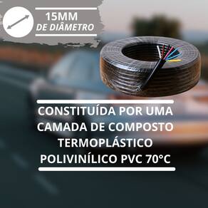 Todas as vias possuem isolamento individual em PVC termoplástico com aditivo antichama, reunidas sob um revestimento externo único em PVC preto altamente flexível, resistente à abrasão, vibração e calor.