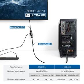 Cable Matters Repetidor DisplayPort (extensor de cabo DisplayPort, amplificador de sinal DisplayPort, amplificador DisplayPort) com suporte para resolução de vídeo 8K - O repetidor DP de 8K permite corridas mais longas entre um computador, um monitor ou um projetor. Estenda este repetidor DisplayPort 8K a 60Hz/4K a 240Hz até 9,8 m; DisplayPort 1,4 suporte para HBR3 de alta largura de banda, largura de banda de 32,4 Gbps, correção de erro de encaminhamento FEC e 32 canais de áudio; este repetidor DP é compatível com DisplayPort 1.2 - Vídeo 8K vibrante e áudio autêntico com suporte DisplayPort 1.4 para resoluções de vídeo de até 8K (7680x4320), incluindo 5K (5120x2880 @ 60Hz), 4K Ultra HD (3840x2160 @ 60Hz) e 1080P (Full HD) - Extensor de cabo DisplayPort 8K, atua como um acoplador de porta de exibição para unir dois cabos sem perda de sinal - Conecte e use com este amplificador DisplayPort portátil e leve; oferece uma alternativa econômica para comprar um cabo DisplayPort caro com mais de 4,5 m de comprimento; as etiquetas de porta de entrada e saída facilitam a conexão correta deste extensor de alcance DisplayPort - Alimentação externa necessária com um cabo de carregamento micro-USB de 1,8 m (incluído) e carregador de parede USB (vendido separadamente); solução ideal para conectar um projetor a um tablet ou notebook pequeno com saída de sinal DisplayPort fraca; duas aberturas de fenda para montagem em superfície