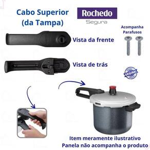Cabo superior da panela de pressão rochedo segura 4,5 / 7,6 litros. O cabo é antitérmico que garante ainda mais segurança durante o uso, pois reduzem a propagação do calor. Acompanham os dois parafusos para fixar na panela. Atenção: não acompanha cabo inferior, alças, válvula de segurança e pino. Somente o cabo superior.