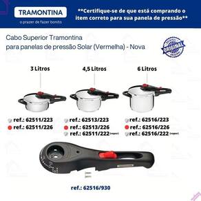 Nosso empenho é procurar o que há de mais atual e funcional no mundo culinário e para organização da sua casa, priorizando sempre a qualidade e a versatilidade dos produtos. Cabo superior para panela tramontina solar nova 3l / 4,5l / 6l Cabo superior da panela tramontina solar nova 3 /4,5/ 6 litros. O cabo é antitérmico que garante ainda mais segurança durante o uso, pois reduzem a propagação do calor. Acompanham os dois parafusos para fixar na panela. Atenção: não acompanha cabo inferior, alças, válvula de segurança e pino. Somente o cabo superior. Serve nos modelos: 3 litros: 62511/223 62511/226 4,5 litros 62513/223 62513/226 62511/222 vapor 6 litros 62516/223 62516/226 62516/222 vapor Referencia: 62516/930 Serve somente no modelo novo - detalhe vermelho Conteúdo da embalagem: 1 cabo superior panela tramontina solar nova 2 parafusos Gostou Esse produto pode ser seu aguardamos sua compra Marca: Não Informado