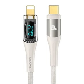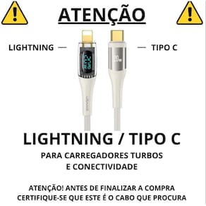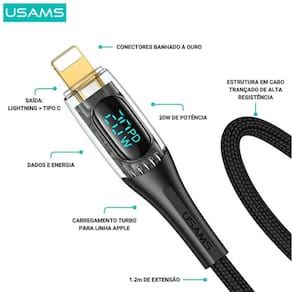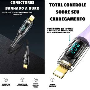 Cabo com display digital para acompanhamento em tempo real da potência, carregamento rápido de até 20W com Power Delivery (PD), construção em nylon trançado para maior durabilidade, conectores banhados a ouro para resistência à oxidação, velocidade de transferência de dados de 480 Mbps.Tipo