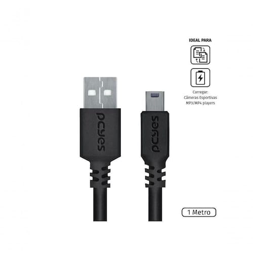 Os cabos da PCYES chegaram para determinar um novo patamar de qualidade para aqueles que buscam mais para seus equipamentos de nível profissional, unindo inovação a um custo acessível! São duas linhas completamente desenvolvidas para suprir as necessidades até do consumidor mais exigente, utilizando de design, alta tecnologia e materiais de qualidade para alcançar a excelência. Projetados com foco nos entusiastas, os cabos da PCYES possuem design exclusivo e 100% brasileiro, que combina robustez com minimalismo, além de levar em si a essência da marca, garantindo maior durabilidade e desempenho. Descrição: Este cabo permite conexão entre computadores e câmeras esportivas, celulares (antigos), MP3 / MP4 players, caixas de som pequenas, HDs externos, vídeo games portáteis ou controles sem fio de video games* de diversas marcas com conexão através de porta Mini USB B. * Verificar compatibilidade do controle Dados Técnicos: Tamanho do cabo: 1M Material do cabo: cobre puro 28 AWG Taxa máxima de transferência: 480 Mpbs Corrente máxima: 5V 500mA (2.5W)